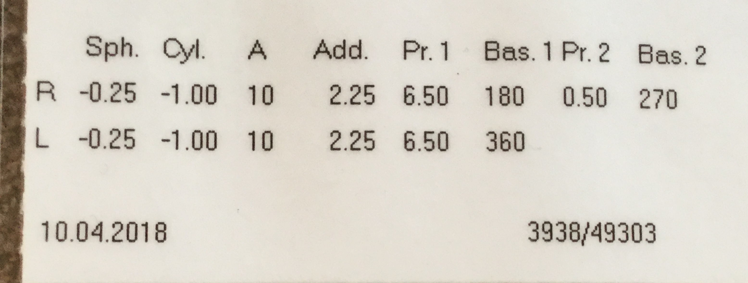 was soll ich sagen, der Optiker sah mich mitleidig an, und teilte mir mit dass aus den 10 Prismen nach 7 Monaten  nun 18 Prismen geworden wären, nun wäre guter Rat teuer. Ich bräuchte sowohl in der gleitsichtbrille als auch Bildschirmbrille diese Prismen, da dies eine gewaltige Korrektur mit ästhetischem Nachteil wäre soll ich noch warten bis es gar nicht mehr geht... was soll ich sagen, bin total fertig und weiß nicht was ich machen soll.....